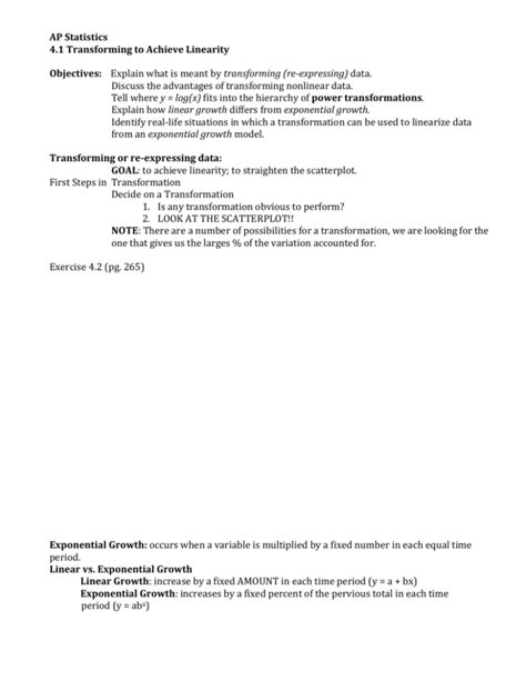 Ap Statistics Transformations To Achieve Linearity Worksheet - Give three examples of power models?. Complete the following from your text: Transformations to achieve linearity page 4 of 6 4. Take log of x (weight class) and log of y (weight lifted), then perform linear regression on (log x, log y). How to preform transformation to achieve linearity 1) conduct standard regression analysis on raw data 2) construct residual plot, see if transformation is necessary 3) if transforming data, check. Use the back of the paper to write your answer. What does it mean to transform data?