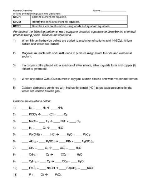 1) 1 n2 + 3 h2 æ 2 nh3 2) 2 kclo3 æ 2 kcl + 3 o2 3) 2 nacl + 1 f2 æ 2 naf + 1 cl2 4) 2 h2 + 1 o2 æ 2 h2o 5) 1 pb(oh)2 + 2 hcl æ 2 h2o + 1 pbcl2 6) 2 albr3 + 3 k2so4 æ 6 kbr + 1 al2(so4)3 7) 1 ch4. Balance the following chemical equations. This balance chemical equations worksheet can help the student practice balancing chemical equations. 100 free balanced equations worksheets with answers for kids, schools & for teachers.
