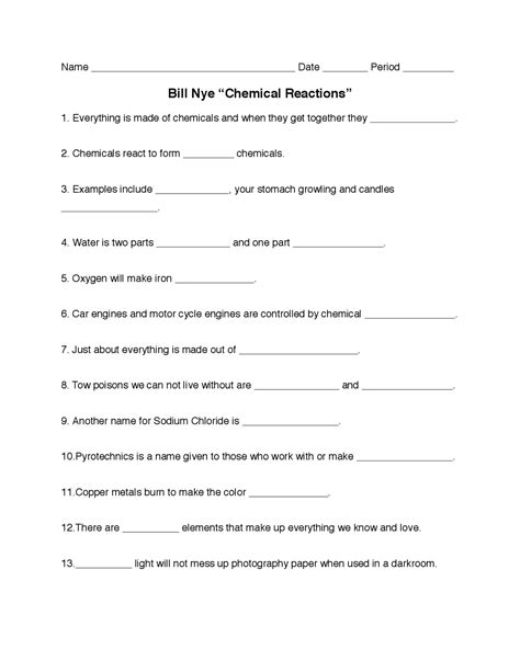 Answer the questions and complete statements from viewing the video. The video guide includes 17 questions (i.e. Chemical reactions happen when the _____(which. Here is my collection of bill nye worksheets from his show, bill nye the science guy.