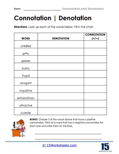 Download and print worksheets to practice identifying and using the connotation and denotation of words. Connotation is the feeling or emotion that a word evokes in addition to its literal meaning. Connotation and denotation practice directions: Up to 24% cash back be sure that the words you use have the right connotation as well as the right denotation.