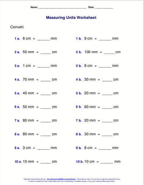 Our grade 5 measurement worksheets give students practice in converting between different measurement units for length, mass and volume within and between the customary and metric. Browse all of our measurement. Below are six versions of our grade 5 math worksheet on converting between different metric units of length. 1 cm = 10 mm 1 centimeter = 10 millimeters 1 m = 100 cm 1 meter = 100 centimeters 1 km = 1000 m 1 kilometer = 1000 meters see more They include conversion of lengths, weights, volumes between different measurement units.