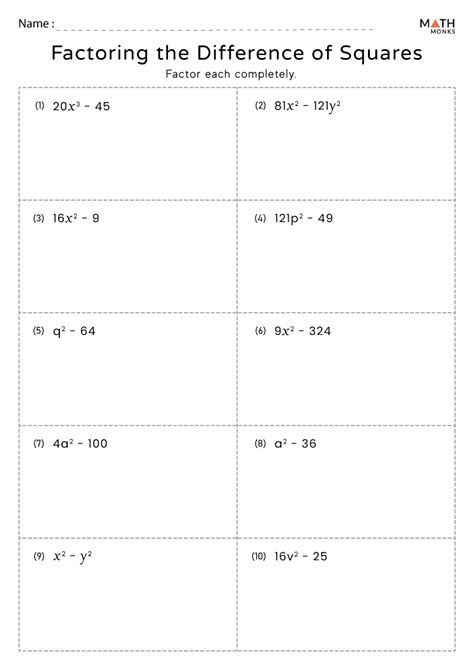 In this video we look at the formula for the 'difference of two squares' which we can use for 🔵 expansions 🔵 factorizations the lesson format will show you. 1) a2 − 49 2) a2 − 64 3) p2 − 144 4) b2 − 25 5) x2 − 9 6) x2 − 4 7) k2 − 121 8) k2 − 36 9) n2 − 289 10) n2. Factorize each binomial completely using the difference of two squares. This worksheet on expanding and factorising the difference of two squares covers everything you need to know about this section for the gcse higher maths paper. Difference of two squares printable worksheet. Factor binomials difference of two squares 1.