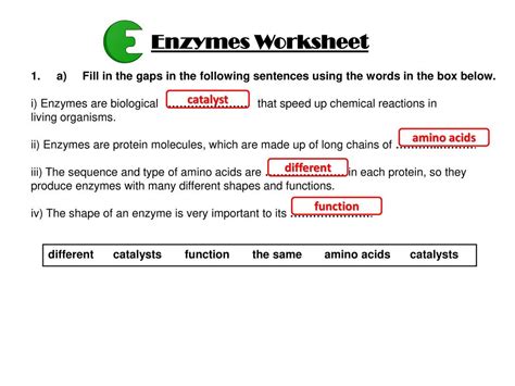 A door that is locked needs a key that is just the right shape to fit in that lock. You can access the answer key, a word document , and a google slides link. A worksheet with questions and answers about enzymes, their functions, structures, and effects. Study with quizlet and memorize flashcards containing terms like what is a biological calaysts that speed up chemical reactions in living organisms?, enzymes are protein molecules, which.