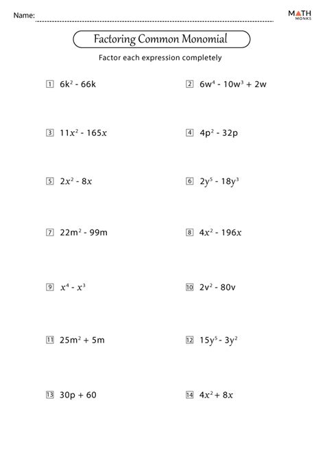 Factoring polynomials 1) first determine if a common monomial factor (greatest common factor) exists. The first step in factoring always begins by checking if there is a greatest common factor. Free trial available at kutasoftware.com. The expressions deal with single as well as multiple variables.