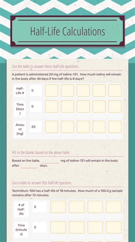 Download your randomized worksheet & key. Estimate how long it takes for the. Calculate the answer to the following problems. List the given and unknown values. Every radioactive element has a different half‐ life. How much of the isotope will you have left after 10 years?