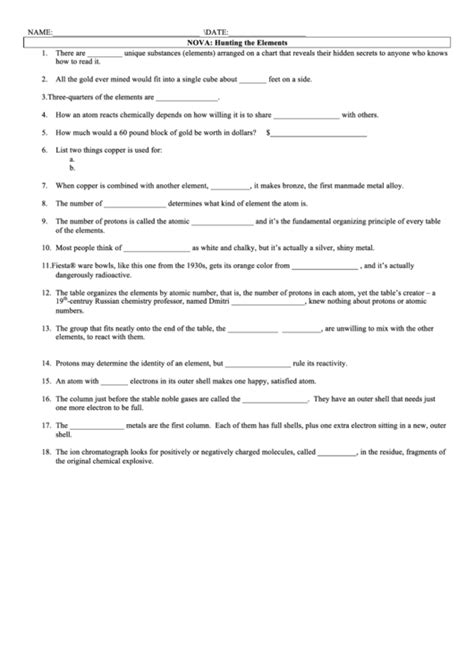 Up to 24% cash back a worksheet with 51 questions based on the nova documentary about the search for new elements. A worksheet for students to review the highlights of the periodic table and their applications, based on the pbs nova special 'hunting the elements'. What is a family of elements? They're the hidden ingredients of everything in our world, from the carbon in our bodies to the metals in. There are ________ unique substances (elements) arranged on an amazing chart that reveals their hidden secrets to anyone who knows how to read it.