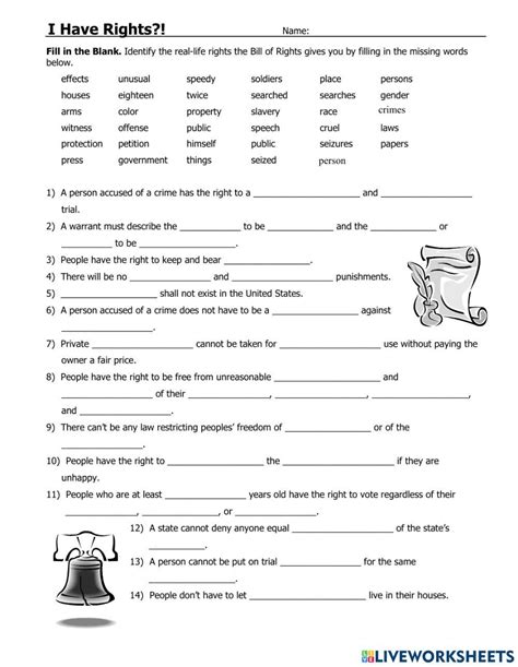 Years old have the right to vote regardless of their race icavacs 12) 13) 14) color or gender a state cannot deny anyone equal protection of the state's laws a person cannot be put on trial. Students will be able to: In this activity students will read through a background of the history of the bill of rights before reading a summarized version of most of the bill of rights. In complete sentences, describe what might happen if each of these amendments were missing from the constitution. Teach students about the bill of rights! This worksheet allows students to use context clues to determine the first 10 amendments and then use what they've learned to answer critical.