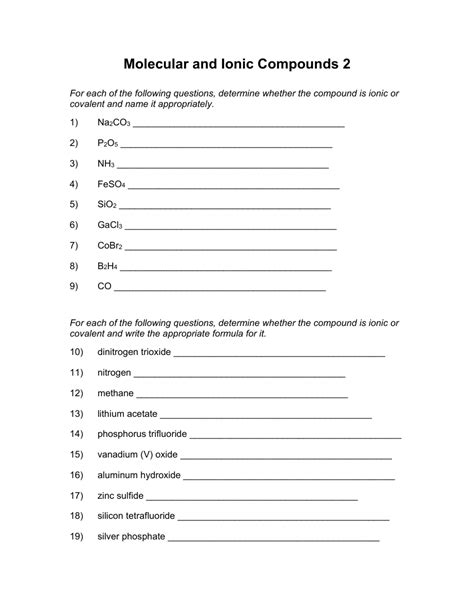 Naming ionic and covalent compounds, acids, and hydrates 9 worksheets to practice naming and writing formulas for ionic and covalent compounds, including acids and hydrates. Naming chemical compounds worksheet name the following ionic compounds: • in naming simple ionic compounds, the _____ is always first, the _____ second (e.g., sodium chloride). Up to 24% cash back forming and naming ionic compounds practice worksheet name: