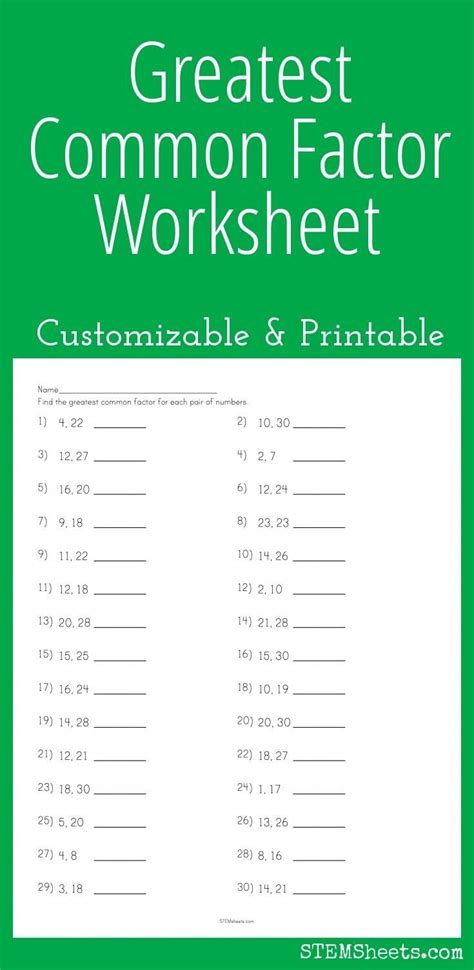 Factoring worksheets covering factors, prime factors, greatest common factors (gcfs) and least common multiples (lcms). This factors worksheet is great for practicing finding the least common multiple and greatest common factor of number sets. Free, printable worksheets provided by k5 learning; Includes a math lesson, 2 practice sheets, homework sheet, and a quiz!