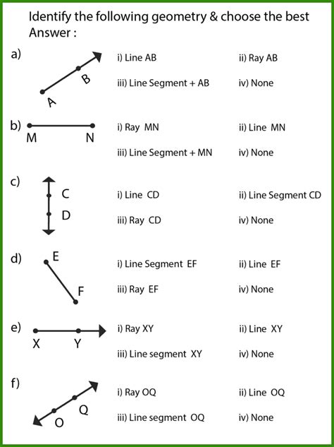 Line Line Segment Ray Worksheet - Lines, segments and rays grade 3 geometry worksheet write line, line segment or ray below each picture. Write if each is a point, line segment, line, or ray and its name. Learn to differentiate between a ray, a line, or a line segment and denote them using specific symbols with our printable worksheets that provide all. In these geometry worksheets, students identify and draw lines, line segments, rays, and acute, obtuse and right angles. These lessons and worksheets will teach students how to identify and use rays, line segments, and basic lines. Lines, segments, rays and angles grade 3 geometry worksheet match each term with the picture that represents it by drawing a line to connect the term to the picture. Point is pictured by a dot.