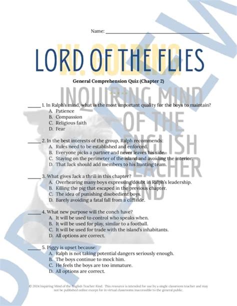 Handout includes two skill based multiple choice questions about the beginning of the chapter (a question on theme and. Chapter 5 shows the boys becoming increasingly angry and divided. Up to 24% cash back use the following worksheets as we prepare to start the reading. In chapter five, “beasts from water,” ralph feels the need to call a meeting to “put things straight.” what has caused things to go awry on the island? * comprehension questions * vocabulary and.