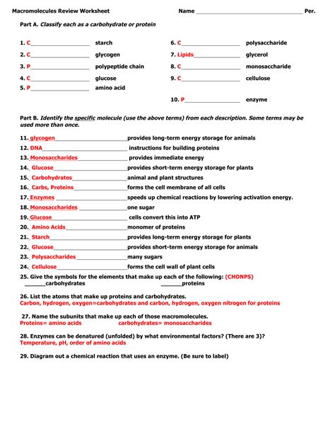 Macromolecule Worksheet Answer Key