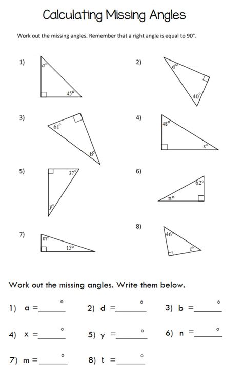 The free printables in this post deal with finding the unknown angles of triangles. Missing angles in a triangle calculate the missing angles in the following triangles: Then learners are challenged to apply this concept as they practice finding missing angles in triangles across two pages of practice problems. By engaging with various triangle configurations and applying angle sum properties, students will enhance their understanding of geometric principles related to angles within triangles.