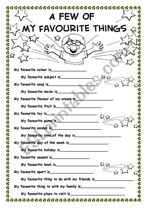 This handy worksheet is a fun way to get the children thinking about their favorite things, and will make a great addition to your lesson. This worksheet is a fantastic tool for helping your child articulate and recognize their preferences. Find various worksheets and activities related to my favorite things for students and staff. Get to know your students' favorite things! Encourage students to share more about themselves with you and their classmates with this worksheet.