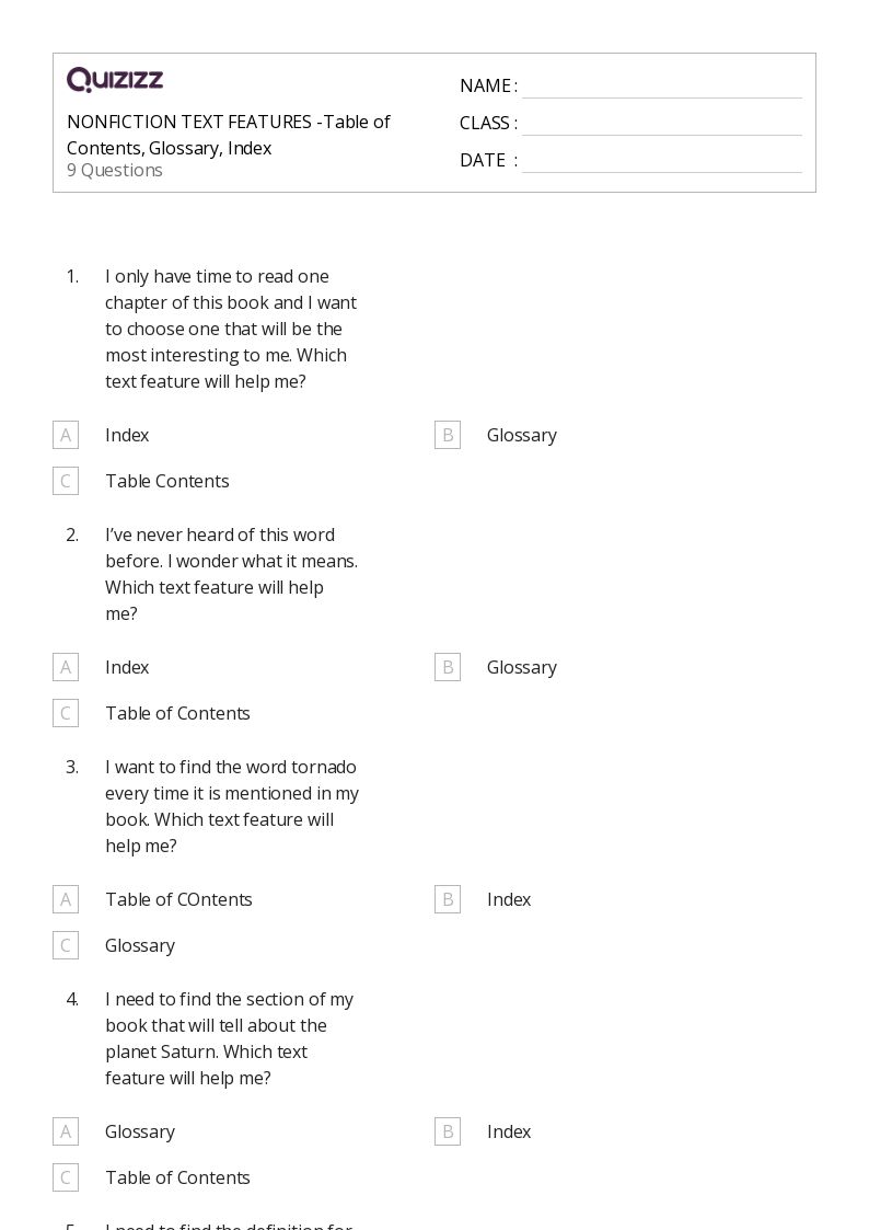 The tasks within the worksheets challenge students to recognize visual and structural elements such as headings, indexes, captions, diagrams, charts, timelines, and maps. Explore, learn, and enhance comprehension with these valuable resources from quizizz. When it comes to nonfiction text features, there is a lot for our students to learn and remember! Looking for a great way to engage and teach students all about nonfiction text features?