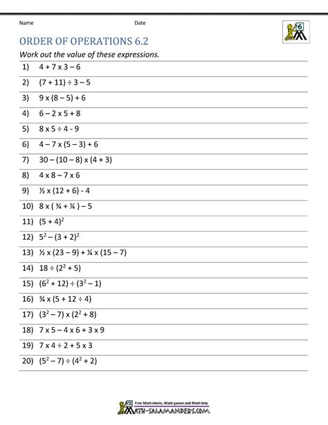 Free Printable Math Worksheets 6Th Grade Order Operations Of With