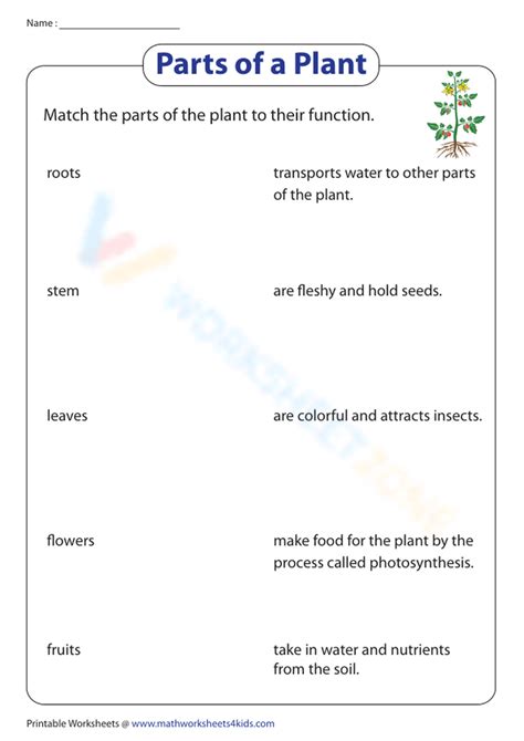 In this exercise, kids in grade 1 and grade 2 identify the parts of a plant and name them. Draw lines from the plant parts to their functions. Parts of a plant worksheet for kids can also help them identify different types of plants. These science worksheets delve into the names and functions of the different parts of a plants. They can provide information about the different parts of plants, how they grow, and what they need to survive. Students will engage in activities that involve identifying these parts and matching them with their specific functions within the plant.
