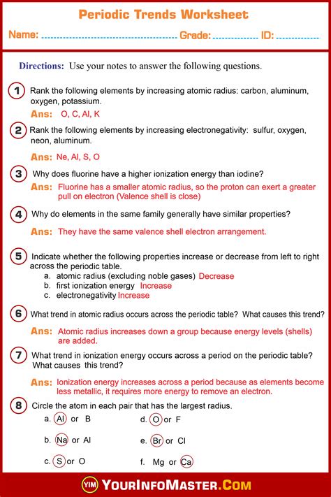 Answer key 3g + f ext periodic trends can the properties of an clement be predicted using a periodic table? Heating and cooling curves part 2 answer key; What trend in ionization energy occurs across a period on the periodic table? Rank the following elements by increasing atomic radius: Use your notes to answer the following questions.