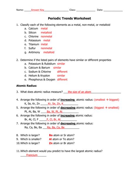 Periodic Trends Worksheet With Answers - Element z is larger than element x. The atomic radius gets smaller as atomic number increases. Atomic size increases down a group and decreases left to right in. What trend in atomic radius do you see as you go down a group/family on the periodic table? Periodic trends atomic radius 1. In chis activity you will look at a few periodic trends that can help you make those predictions. Identify each element as a metal, metalloid, or nonmetal.