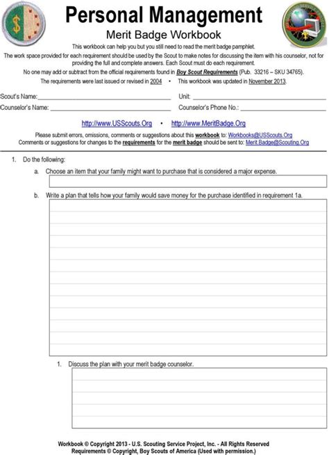 Discuss your completed project plan with your merit badge counselor. Merit badge workbooks and much more are below: This workbook can help you organize your thoughts as you prepare to meet with your merit badge counselor. People today do not stay at one job for their lifetime. Personal management merit badge workbook this workbook can help you but you still need to read the merit badge pamphlet.