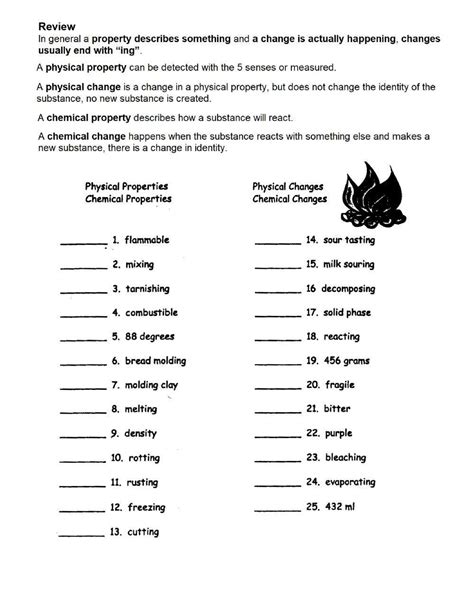 Go to the answers for the first seven examples This worksheet teaches your student about matter, mass, and property, then challenges him to identify whether a change is physical or chemical. Give one example each of a physical and a chemical change. The first one has been done for you to use as an example.