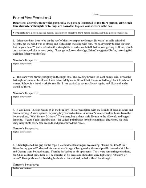 Point Of View Worksheets - Point of view worksheet 3 directions: Here is a powerpoint slide show covering the five narrative view points. This page will show you an effective way of teaching students how to identify the narrator’s view point. Explain your answers in the box. Read the following passages and determine the narrative perspective, then explain how you were able to identify the point of view. There are five possible view points from which a text can be narrated. It includes a practice activity with five questions at the end of the slide show.