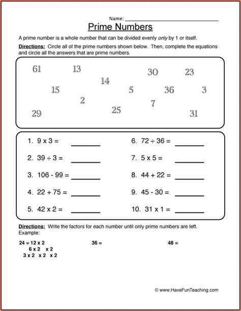Here are more than 25 prime and composite number worksheets, carefully designed for grade 4 through grade 6 students. Prime and composite numbers worksheets promote an understanding of how to solve questions involving prime and composite numbers. 1 and 3 because 3 has only two factors, it is a prime number. 1, 2, 3, and 6 Prime numbers are defined as numbers greater than 1 that have no divisors other than 1 and themselves. Free printable and online worksheet with answers.