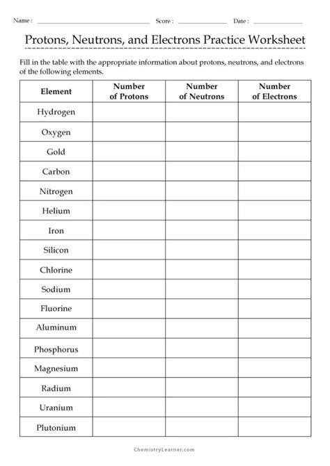 Protons, neutrons, and electrons practice worksheet helpful concepts: Fill in the blanks in the following worksheet. Use the periodic table to find the numbers of protons, neutrons, and electrons for atoms of the following elements. Please keep in mind that the isotope represented by each space may not be the most common isotope or the one closest in atomic mass to the value on the periodic table.