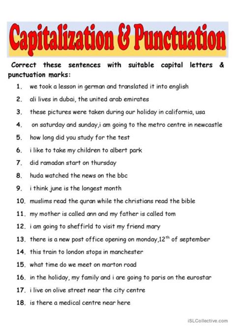 Capitalizing the first letter of sentences; Free, printable punctuation worksheets to develop strong grammar, language and writing skills. Use in class or home. Capital letters for proper names;