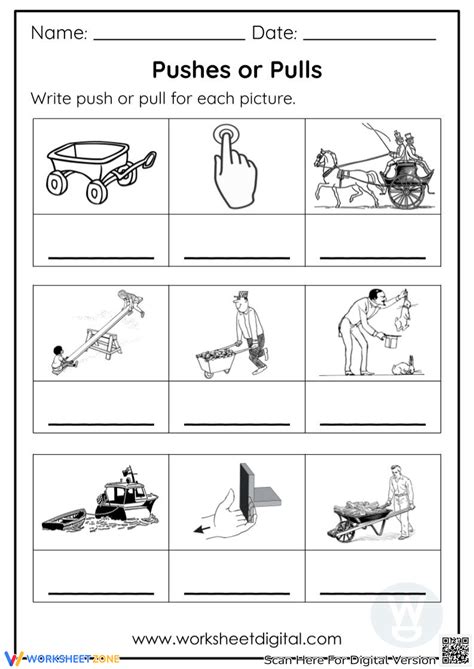 Our push and pull worksheets provide some of the simplest illustrations of how these forces act on an object as well as exercises like identifying the type of force or sorting forces as a push or pull. Free | printable | grade 2 | science | worksheets. K5 learning offers free worksheets, flashcards and inexpensive workbooks for kids in kindergarten to grade 5. Students identify pushes and pulls based on the images shown.