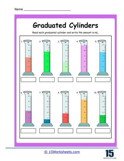 Using ten interactive problems, students gain proficiency in volume. These worksheets will provide you with a good practice set before you get in the lab. When reading a graduated cylinder you need to keep the graduated cylinder on the desk and lower your eyes to the level of the meniscus and. Students must accurately read the measurments on the graduated cylinder illustrations. It has 6 graduated cylinders to record liquid measurements in ml and 6 graduated cylinders for the.