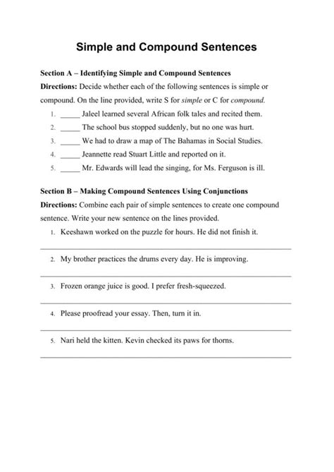 Compound Sentences Worksheets Simple and Compound Sentences Worksheet