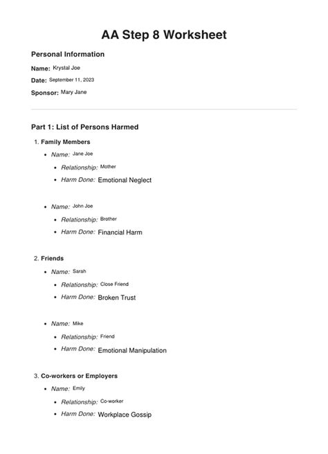 Write inventory on your most serious shortcomings around the practical application of this. Discuss your worksheet and potential amends with your sponsor. This 8th step worksheet is fantastic for newcomers or anyone who wishes to do formally work these steps by rigorously cleaning up their side of the street, thereby. Made a list of all persons we had harmed, and became willing to make amends to them all.
