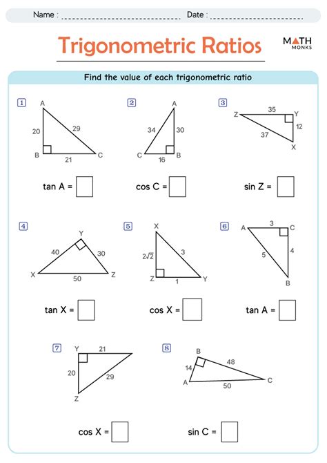 Boost 8th and 9th graders’ trigonometry skills with our detailed trigonometric ratios worksheets, designed to reinforce key concepts effectively. Plus each one comes with an answer key. Exact values of trigonometric ratios: Trigonometric ratios are defined as the ratios between edges of a right triangle.