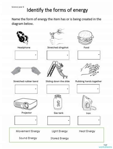 The first one has been done. Learn about the different forms and types of energy with these printable worksheets. Your kids will have a blast matching colorful illustrations of different sources of energy, such as a candle, a fire, and. The types of energy and forms of energy worksheets worksheet is designed to engage students in understanding the. This worksheet contains various questions to help your students learn (or review) basic concepts about forms of energy.