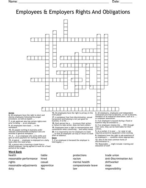 Workers Rights Practice Worksheet Crossword Puzzle.