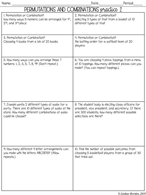 These worksheets provide a variety of problems that challenge students to apply their knowledge of permutations and combinations in different scenarios, allowing them to develop a deeper. These worksheets provide a variety of exercises and problems that challenge students to apply their knowledge of permutations, combinations, and other related concepts. Then find the number of possibilities. Find the number of unique permutations of the letters in each word.