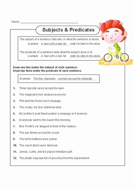 This worksheet features 20 practice sentences themed around. Underline the subject and encircle the predicate. Have a friend identify the simple subject and the simple predicate in your sentence. Identify the underlined portion of the sentence. Underline the complete subject of each sentence below.